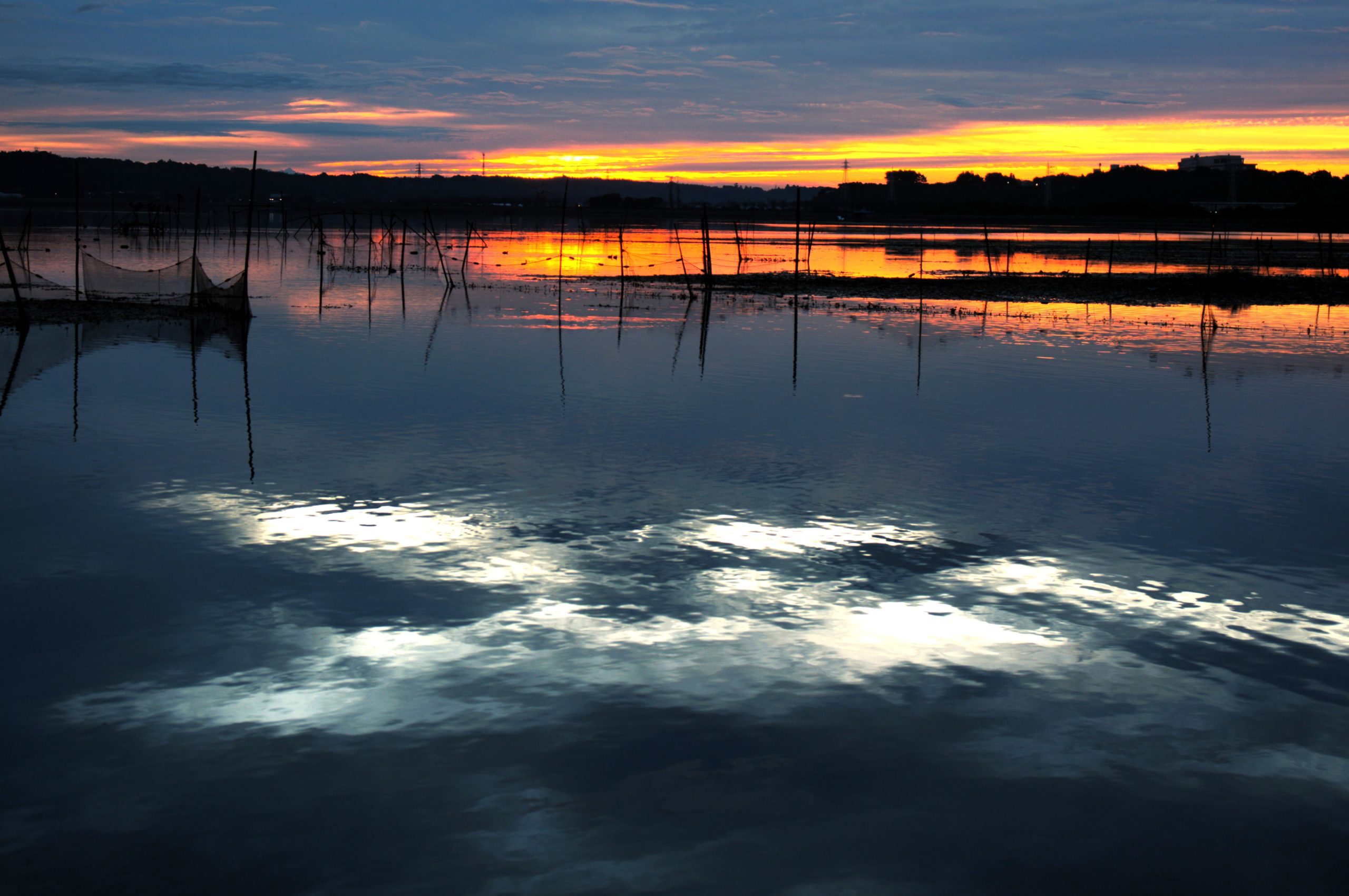 ③説明      :まだ暗い時間に夜明け前の印旛沼に出かけました。早朝の印旛沼は風も無く上空は厚い雲で覆われていました。暫くして雲の切れ間から白い光が湖面を照らし出す、珍しい光景が現れました。朝日が昇ると黄金色に輝く光景が一面に広がりました。