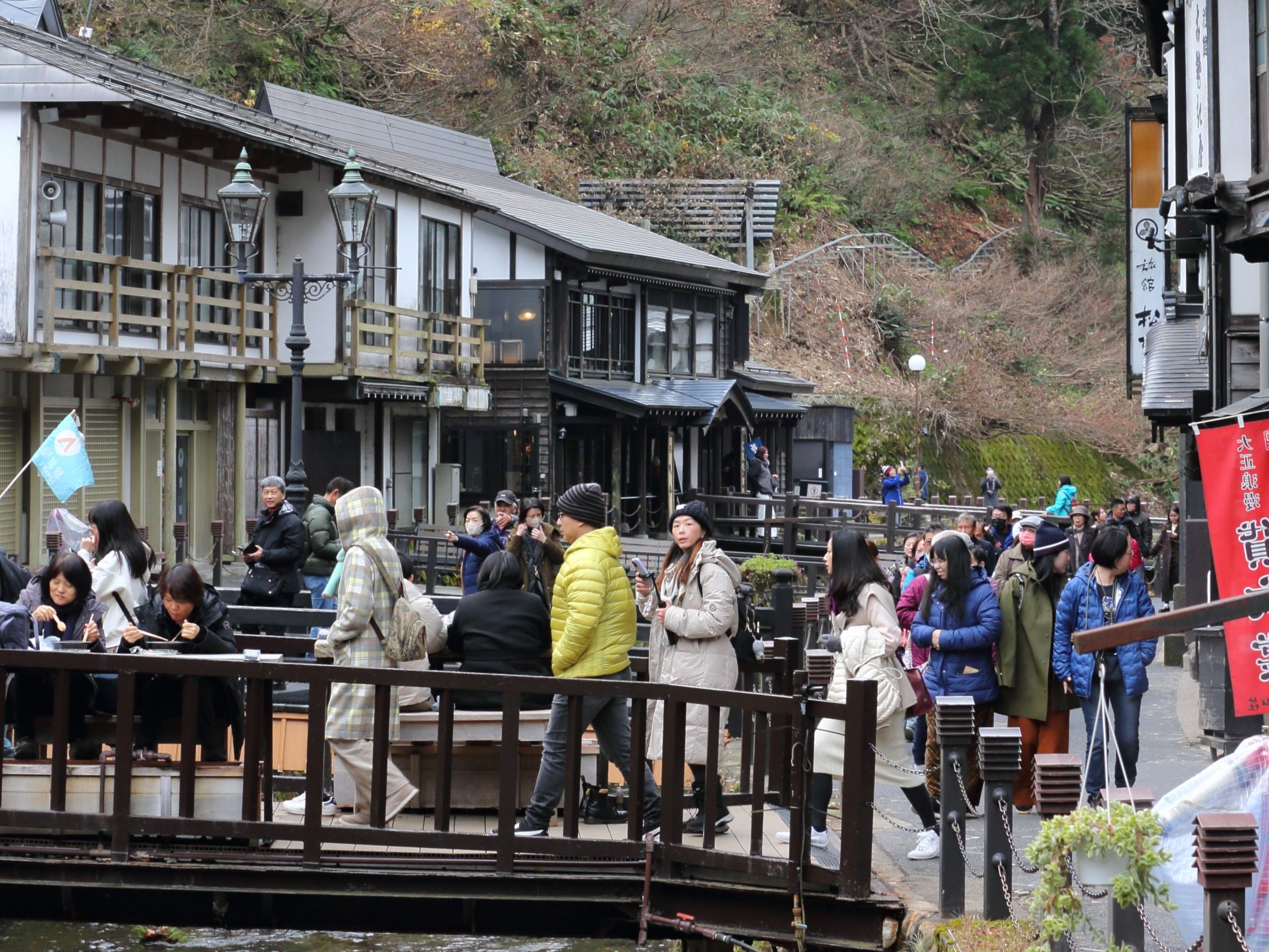 ③説明      :晩秋の「大正ロマン漂うレトロ」銀山温泉を尋ねたら、何とここも「インバウンド」(東南アジアからの来日)、降雪は無かったが、「おしんの故郷」は、相変わらずの人気でした。
