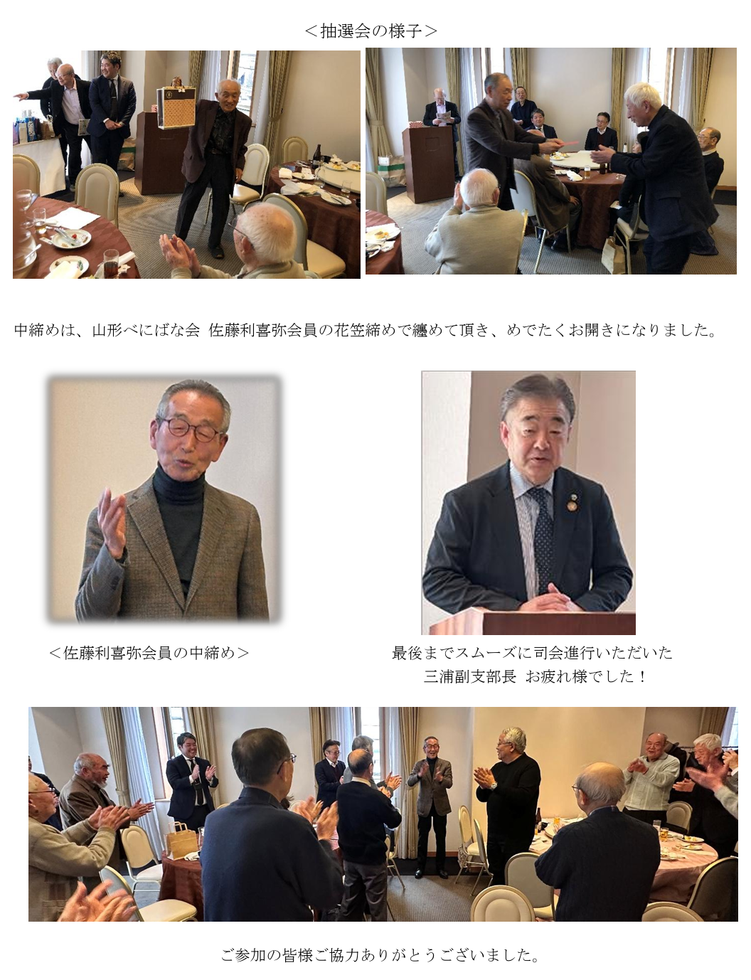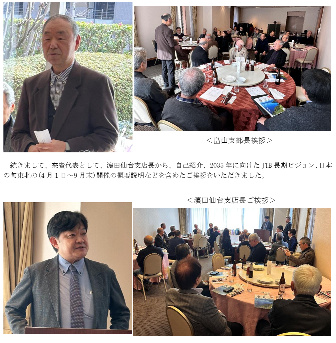 寒波が続いておりますが、暖かく快晴に恵まれ、ご来賓3名・会員24名の計27名参加で開催いたしました。ご来賓は、(株)JTB仙台支店 濵田支店長・(株)JTB人事チーム 佐藤人事担当マネ―ジャー ・ 株)JTBコミュニケーションデザイン インバウンドソリューション局 武宮営業二課長の皆様にご臨席頂きました。 司会は三浦副支部長で開会、はじめに、畠山支部長から挨拶があり、会員状況、東北支部HP開設などのお話がありました。