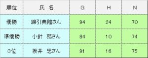 最年長の綿引さんが優勝…結果は、以下のとおりでした。(池田 記)