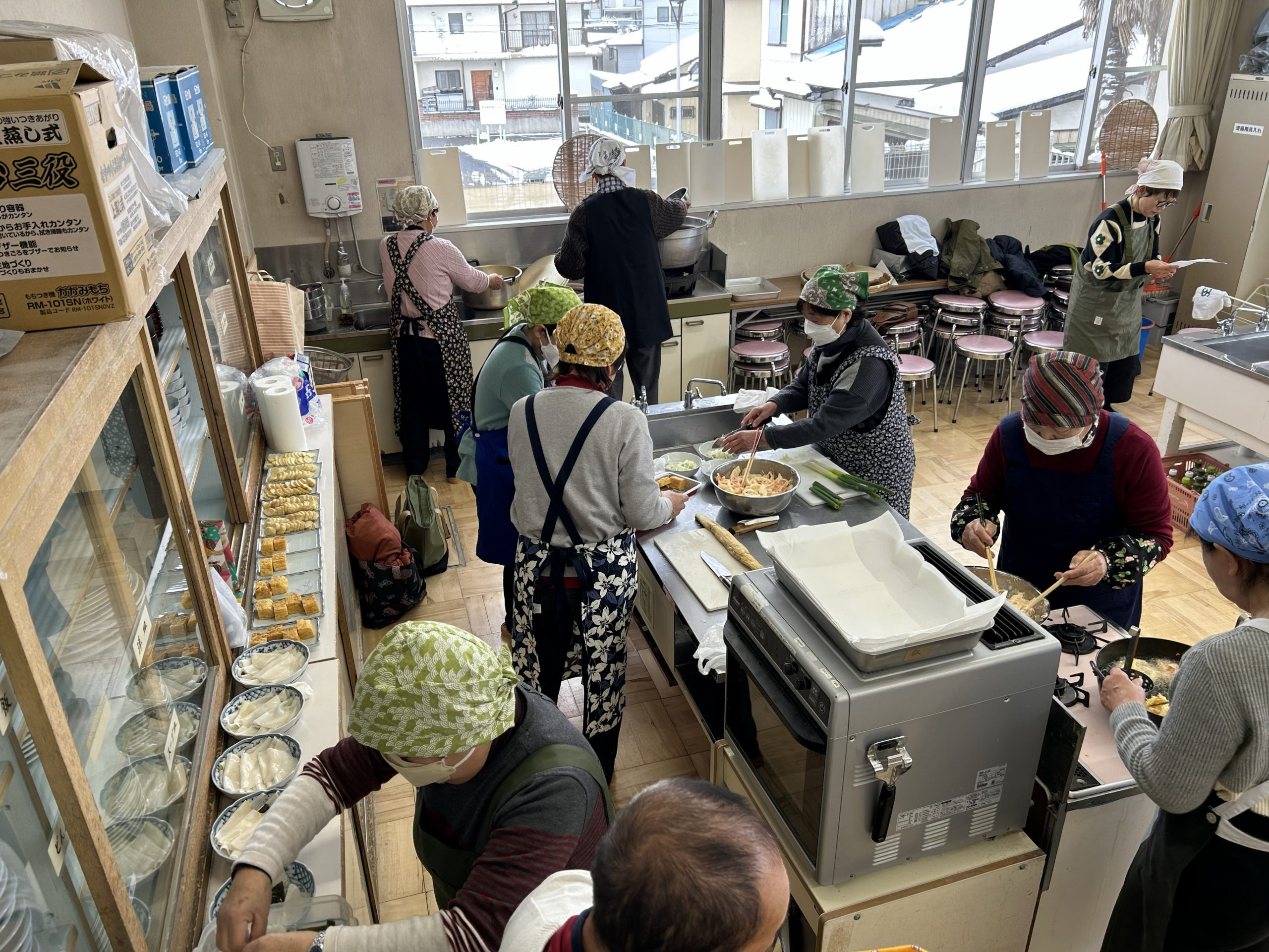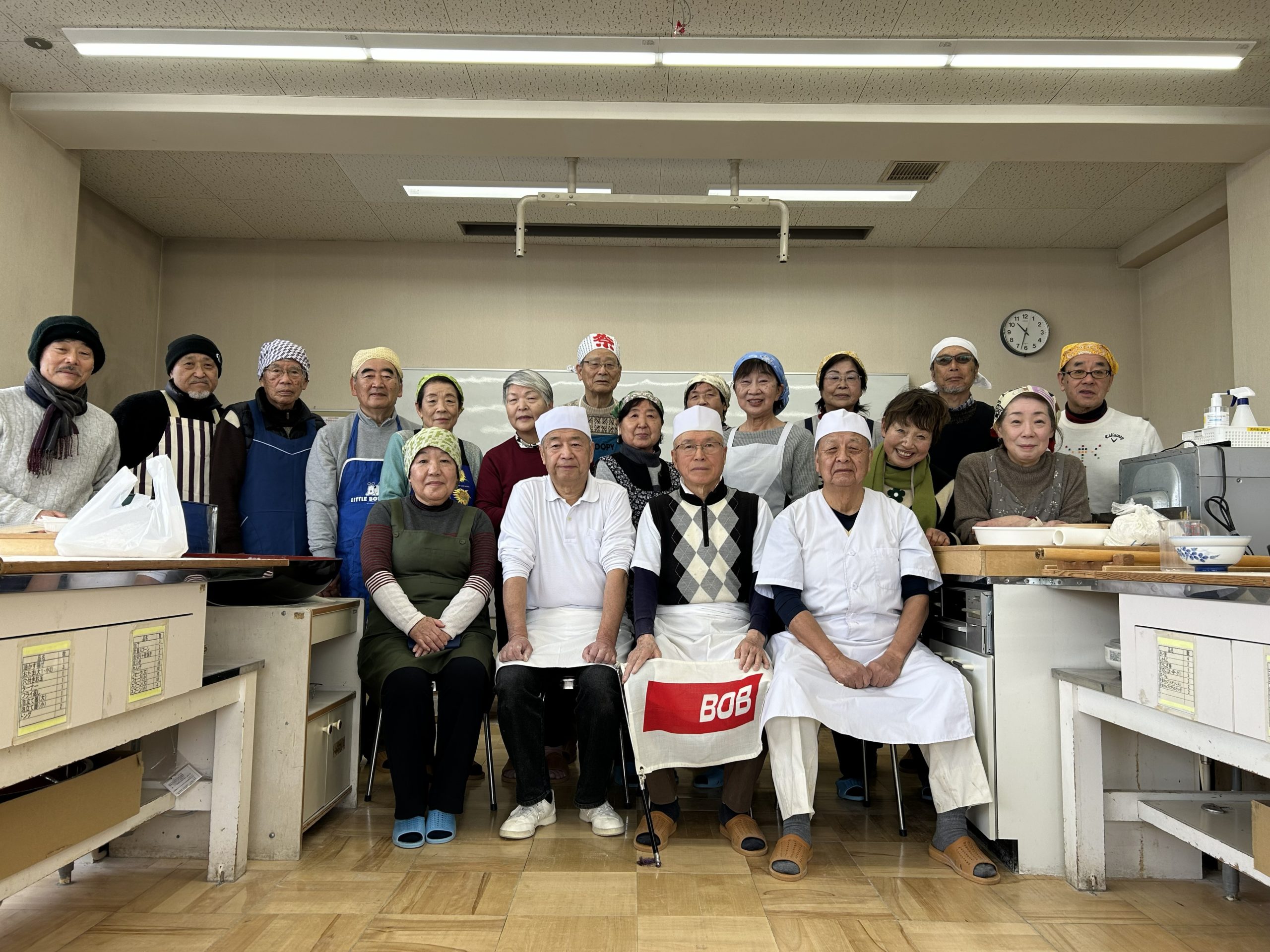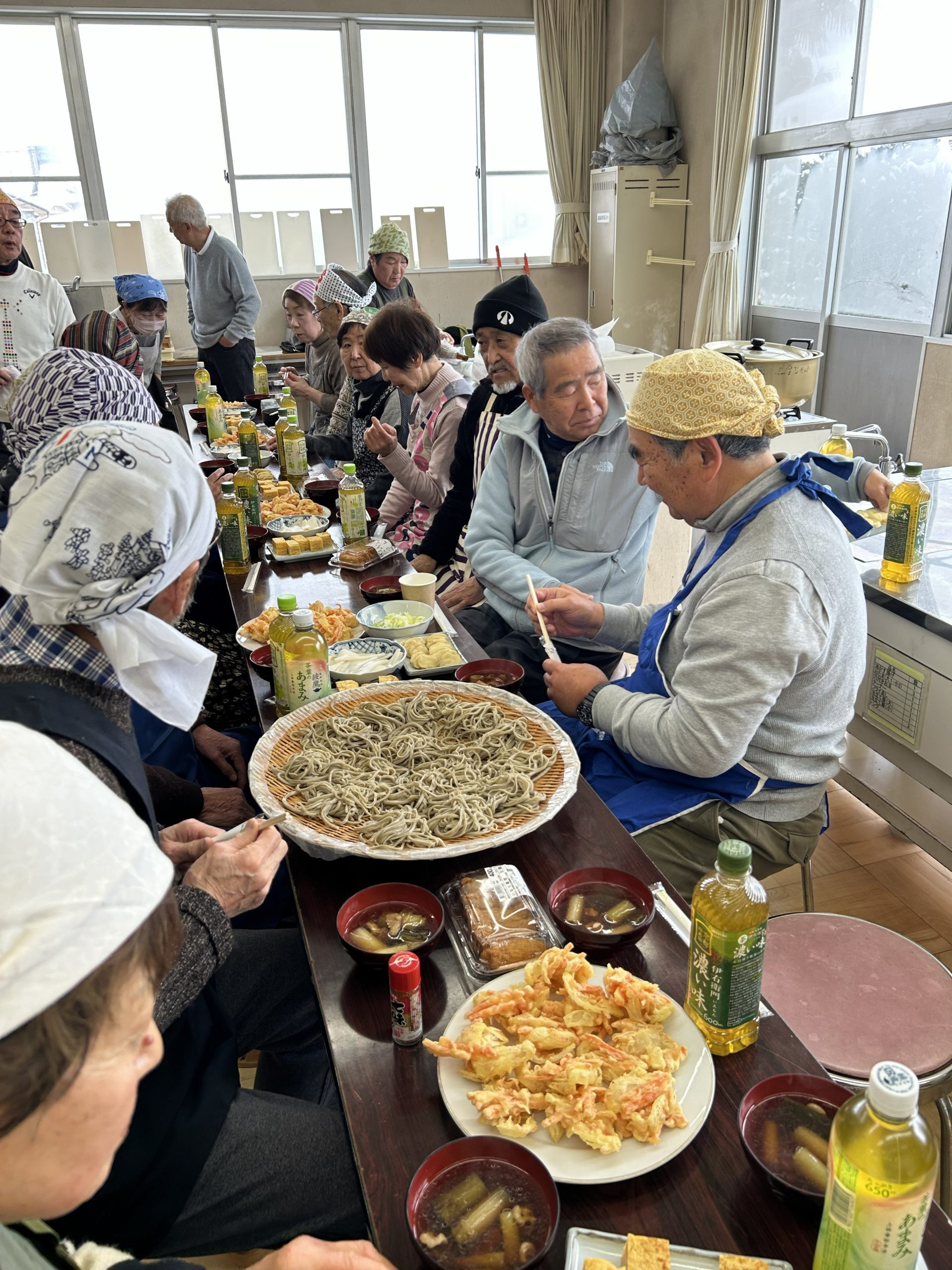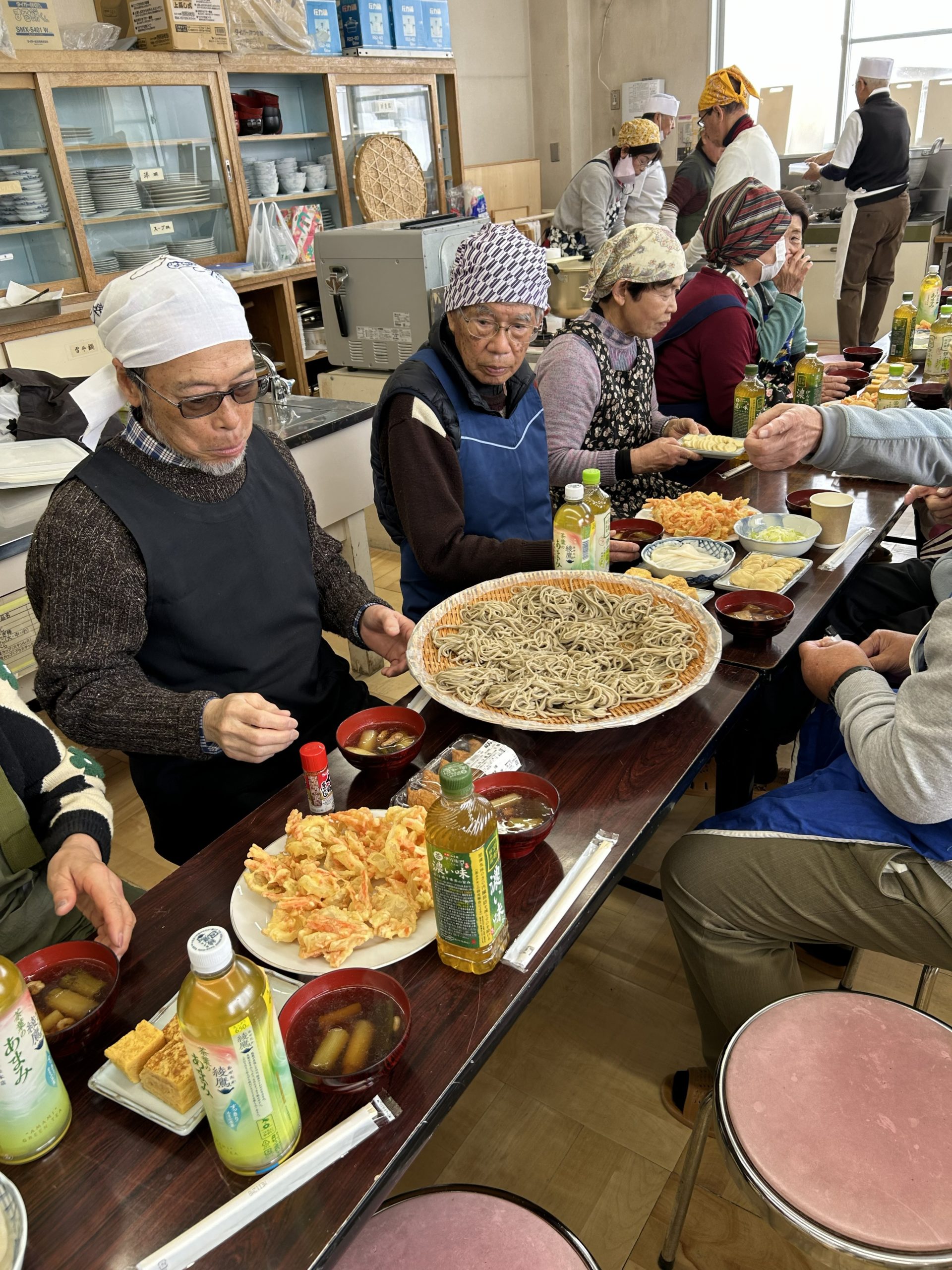 なんたい俱楽部の蕎麦打ち名人3名。いつも人気の特製鴨汁、おしゃべりしながらのかき揚げ天作りとみんなで腕をふるいました。いつもの美味しい手作りたくあんと千枚漬け等の差し入れも頂きました。持ち帰りのお蕎麦とたくあん等はご家族への良いお土産になりました。例年通りの抜群の味と楽しい時間はなんたい俱楽部の名物です。