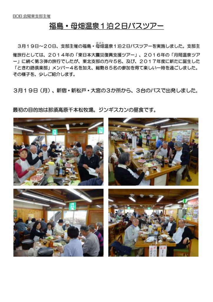BOB会関東支部主催福島・母畑温泉1泊2日バスツアー 3月19~20日(報告)